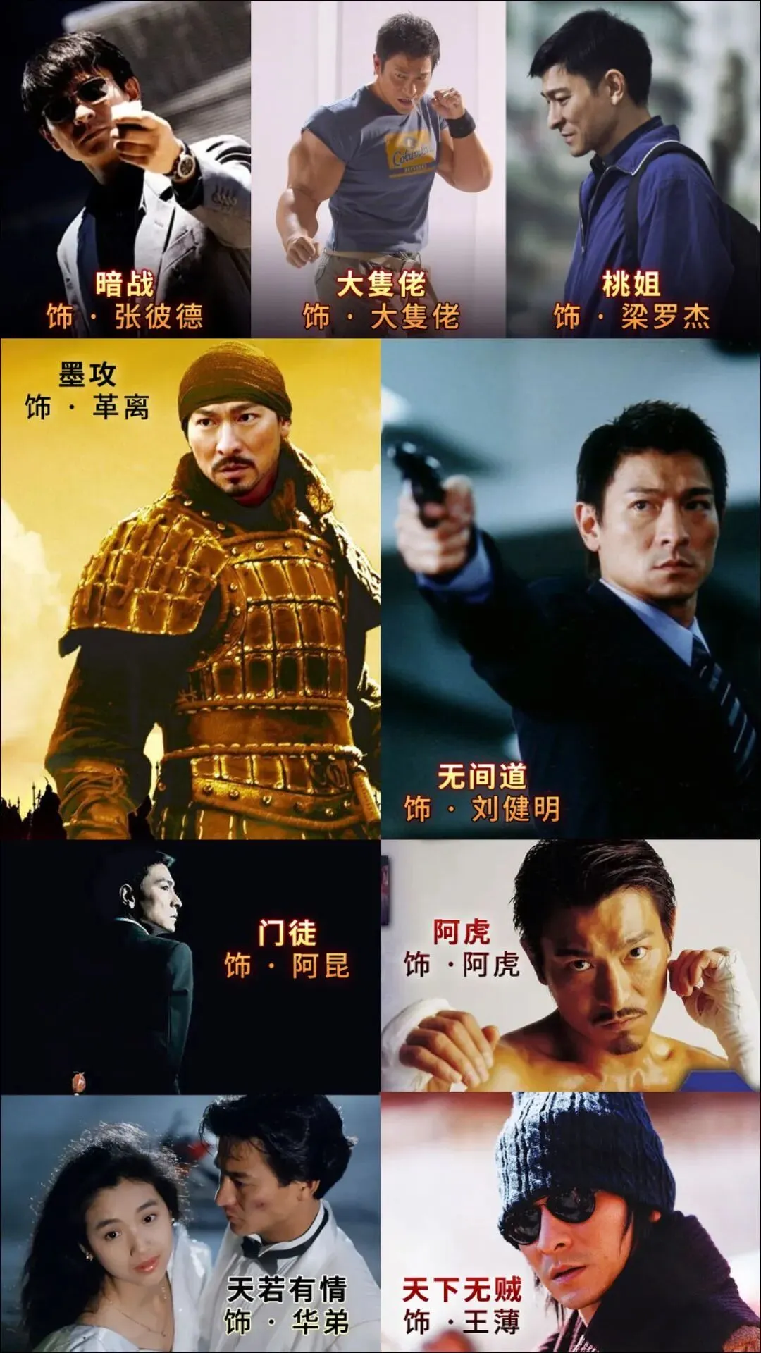 《父子》中的周長勝,《白銀帝國》中的康三爺,《最愛》中的趙得意,《浮城大亨》中的布華泉,《寒戰》中的劉杰輝,《踏血尋梅》中的阿臧,《無雙》中的李問。從馬來西亞廚師、舊年代票號少東、北方農村青年,到英殖民地時期商業大亨、香港警隊一哥、吉隆坡華人黑警、偽鈔集團首腦、安南悍匪和幫派大佬。這不止是角色的轉換,而是從形貌、坐臥行止、人物氣質、表演方法的全部重塑。
