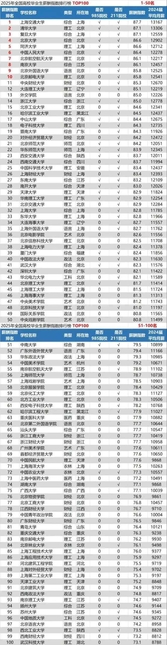 此前,中國薪酬指數研究機構發布《2025年全國高校畢業生薪酬指數排行榜TOP100》!