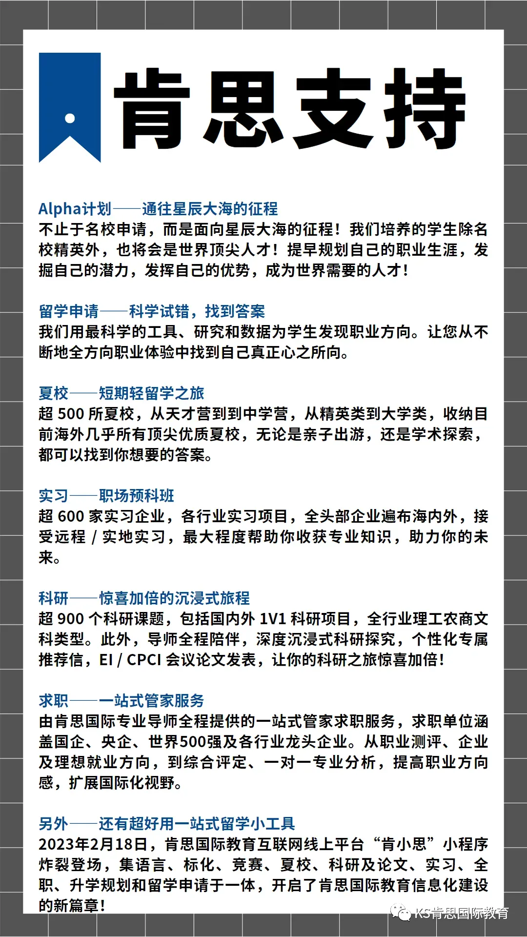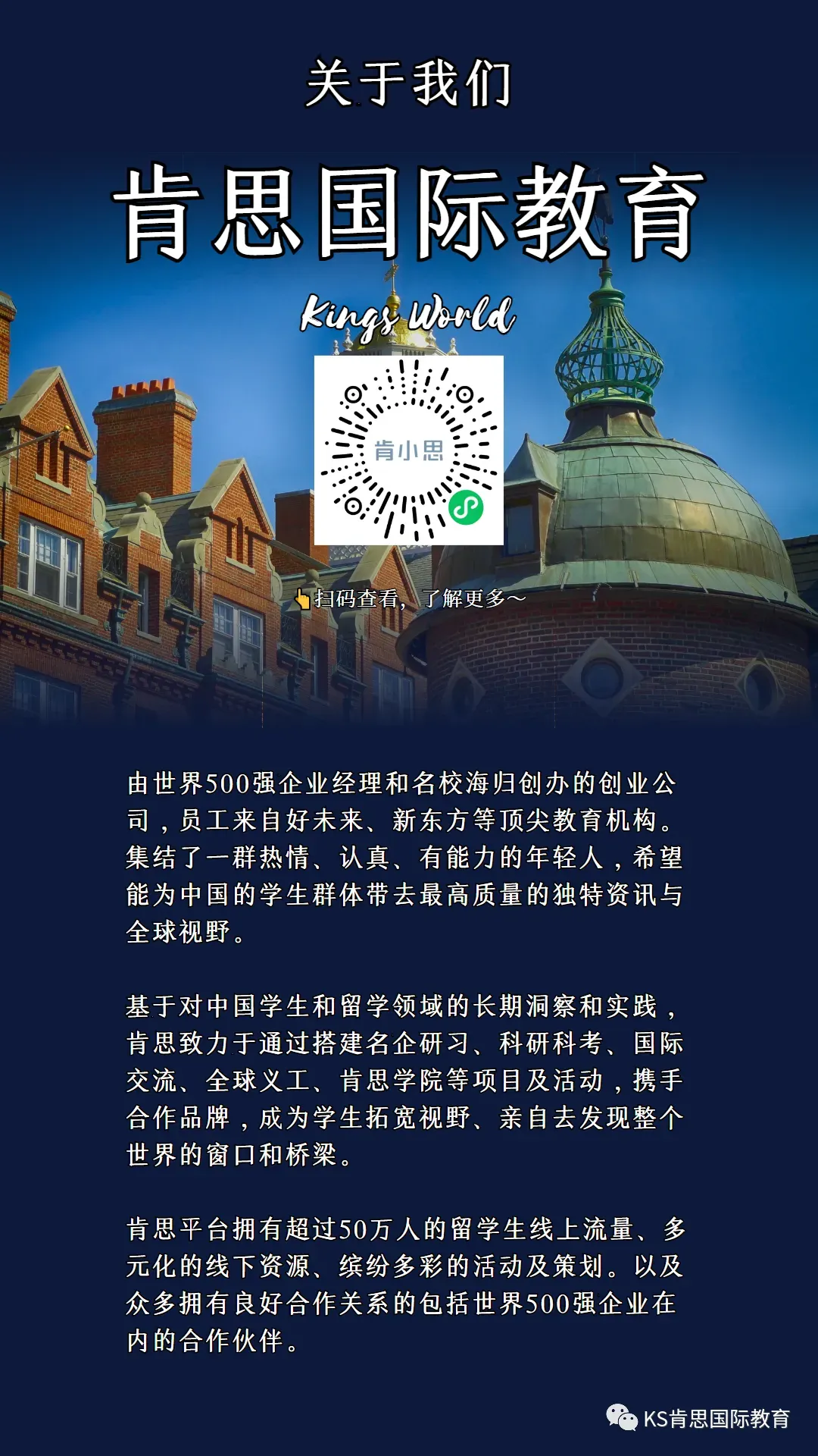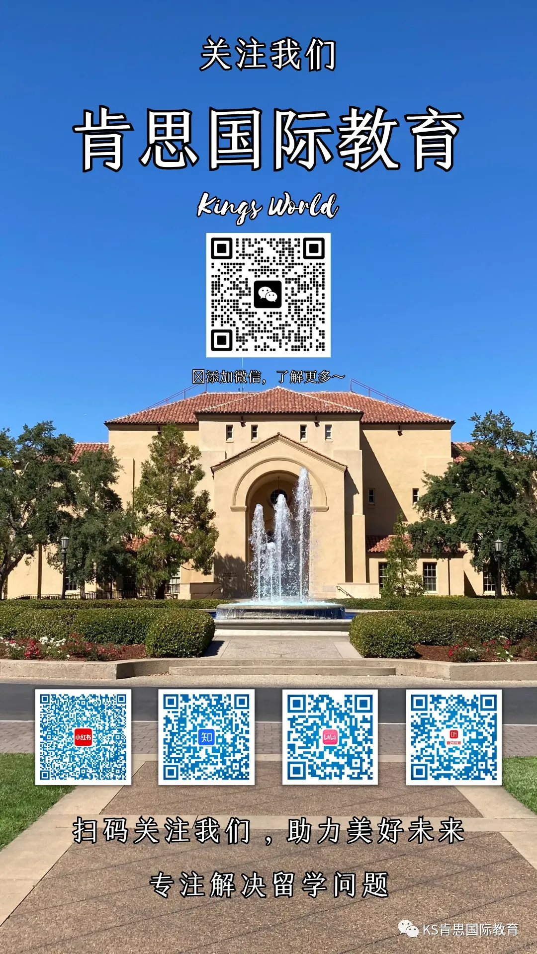 想了解更多關于美國留學申請,或者是托福等培訓的同學,可以聯系顧問老師獲取你的專屬規劃方案,也可以添加“肯小思”小助手微信咨詢(VX:kingsworld04)