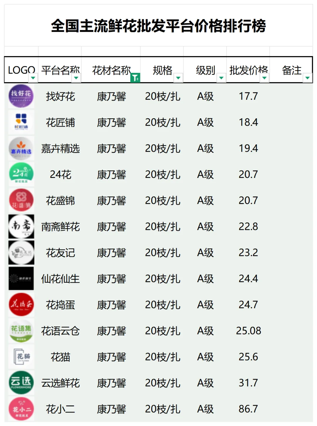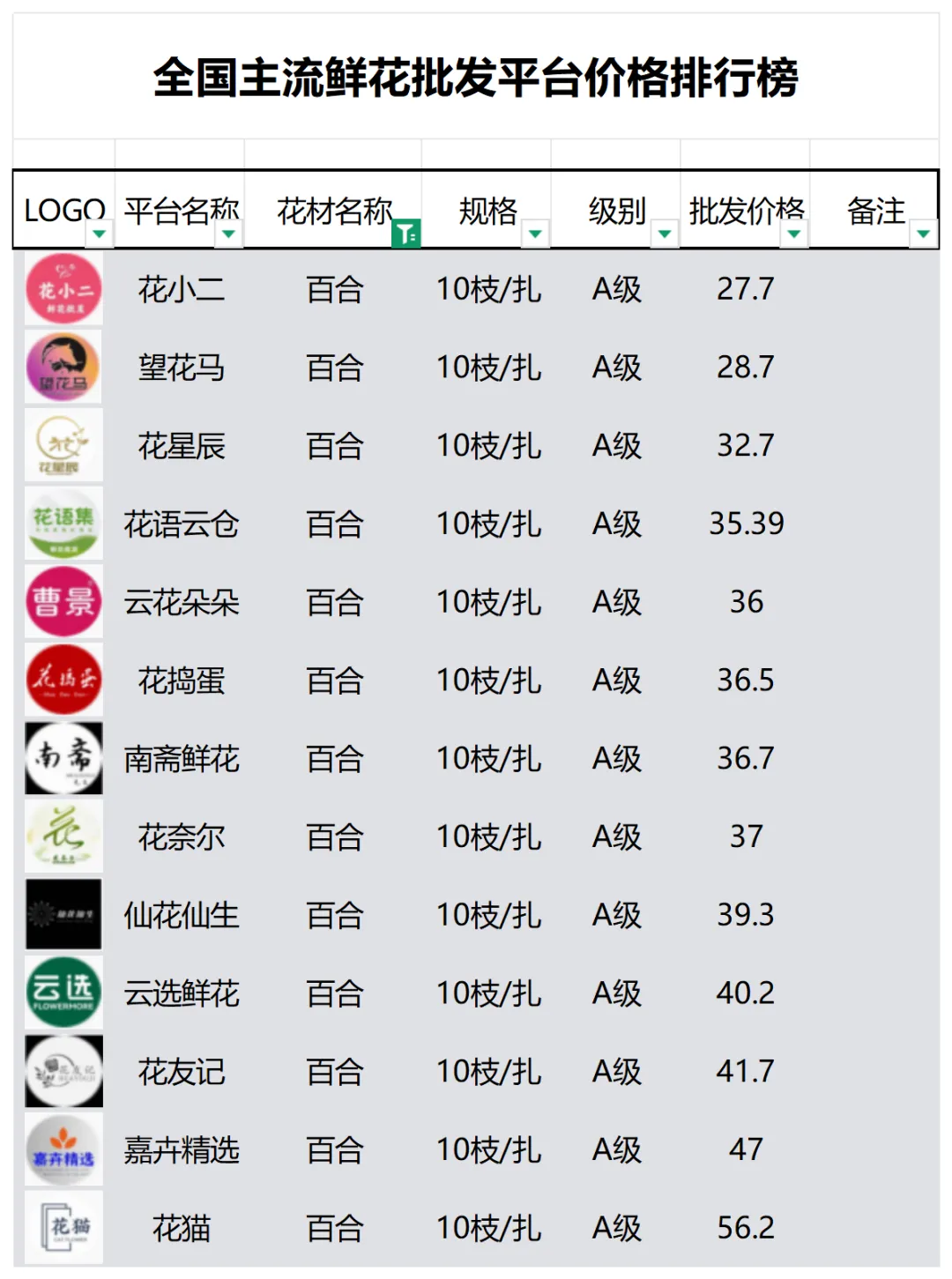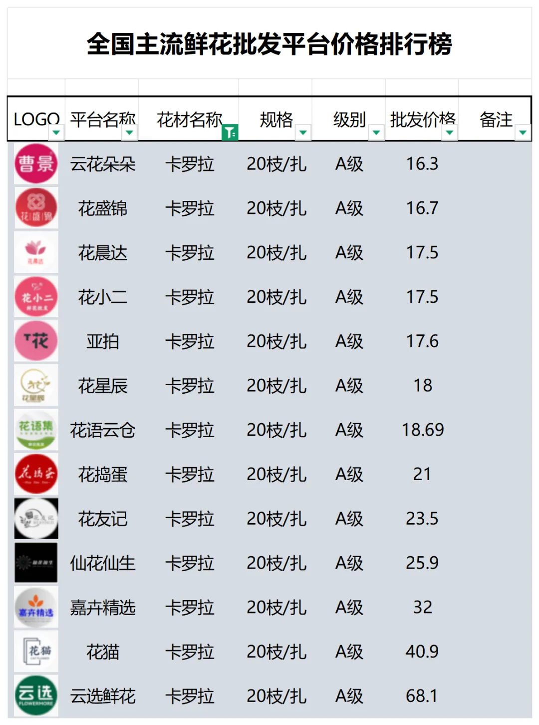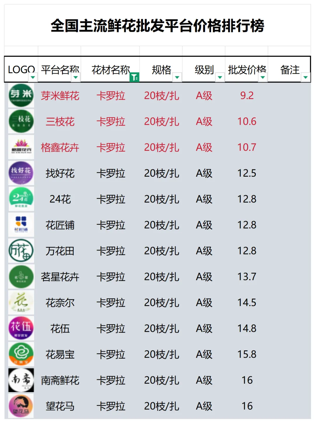 2、本數據只收錄A級花材批發價格,覆蓋全國大部分主流鮮花批發平臺