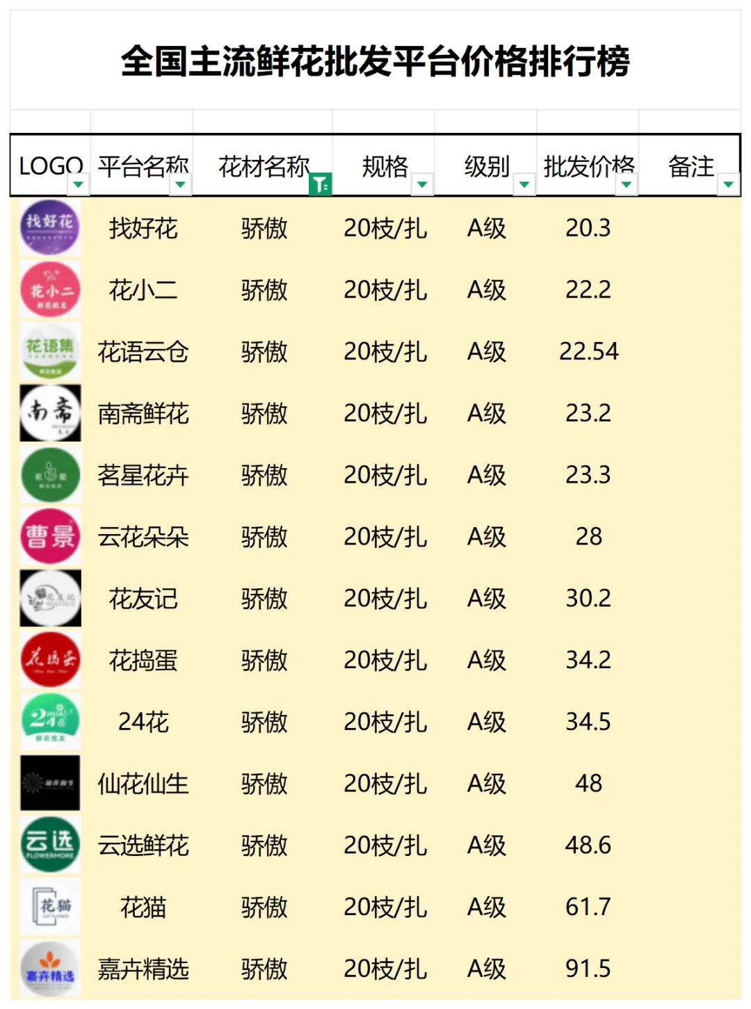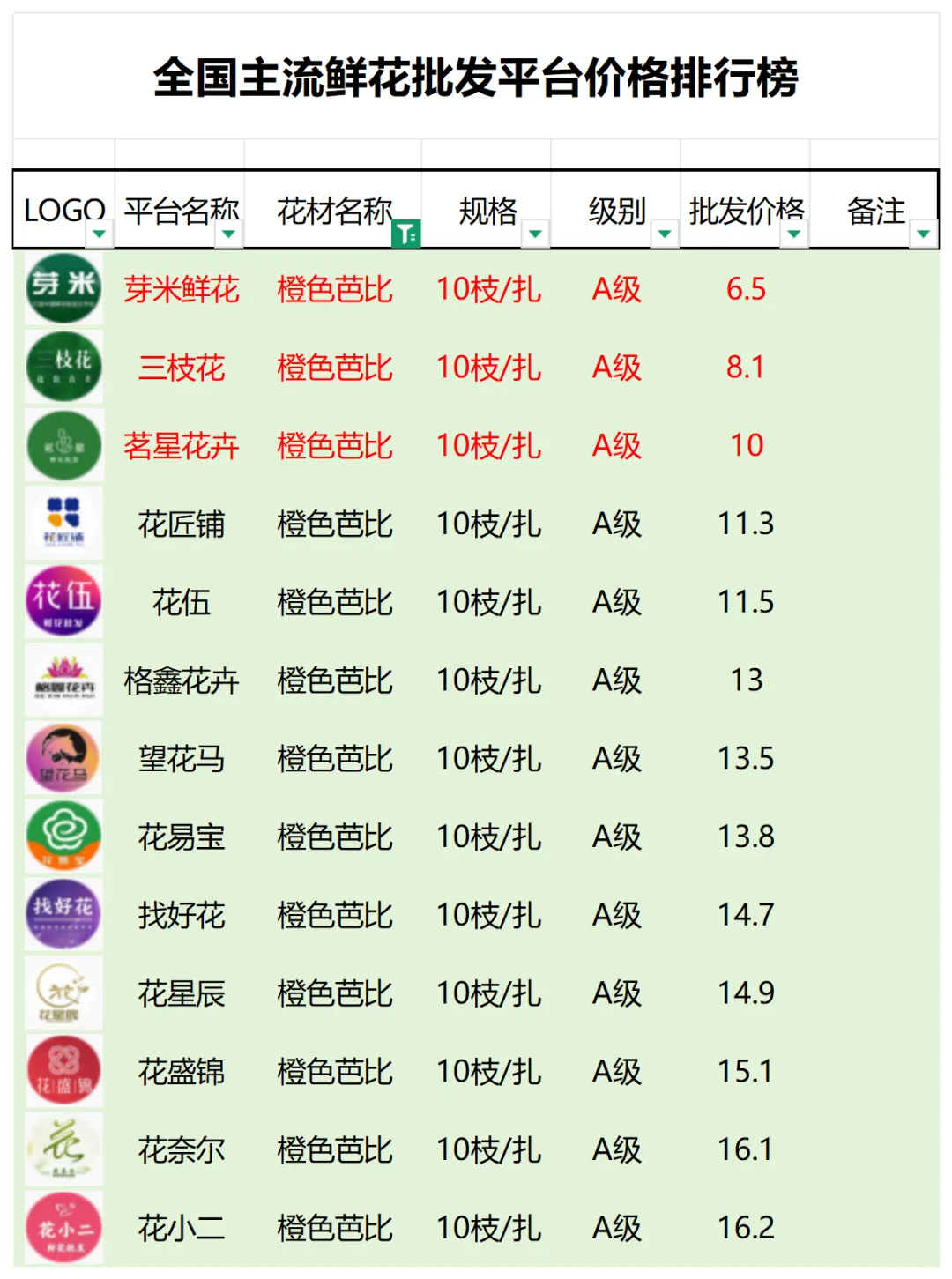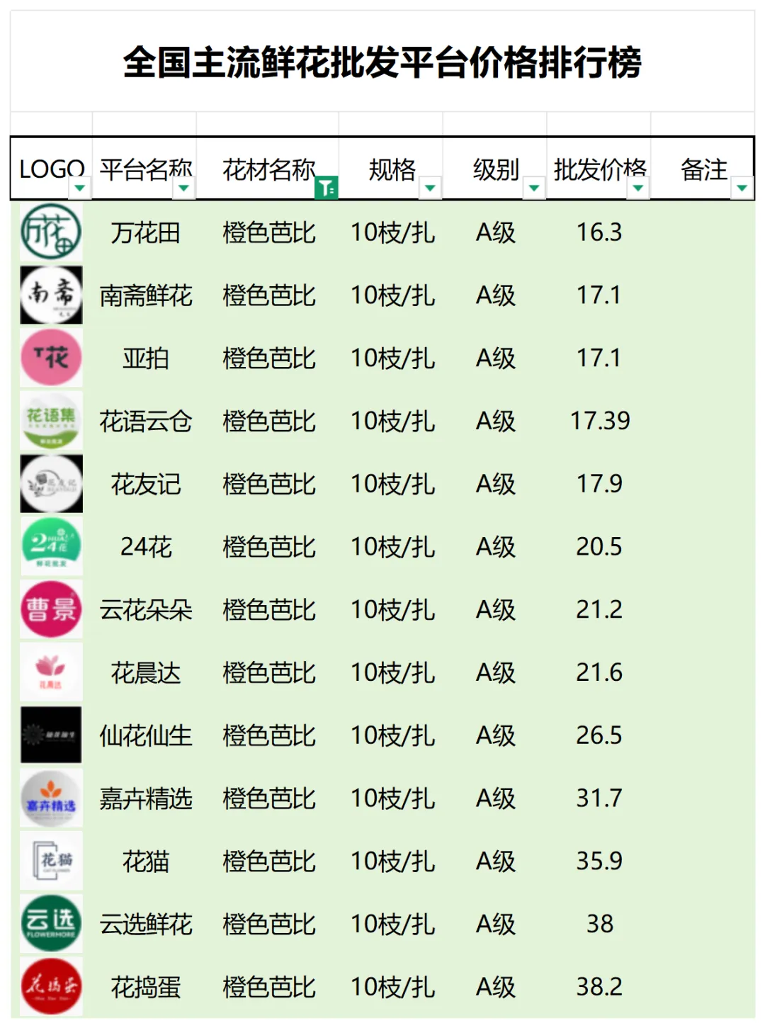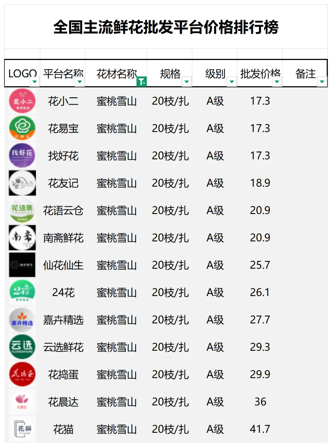 2、本數據只收錄A級花材批發價格,覆蓋全國大部分主流鮮花批發平臺