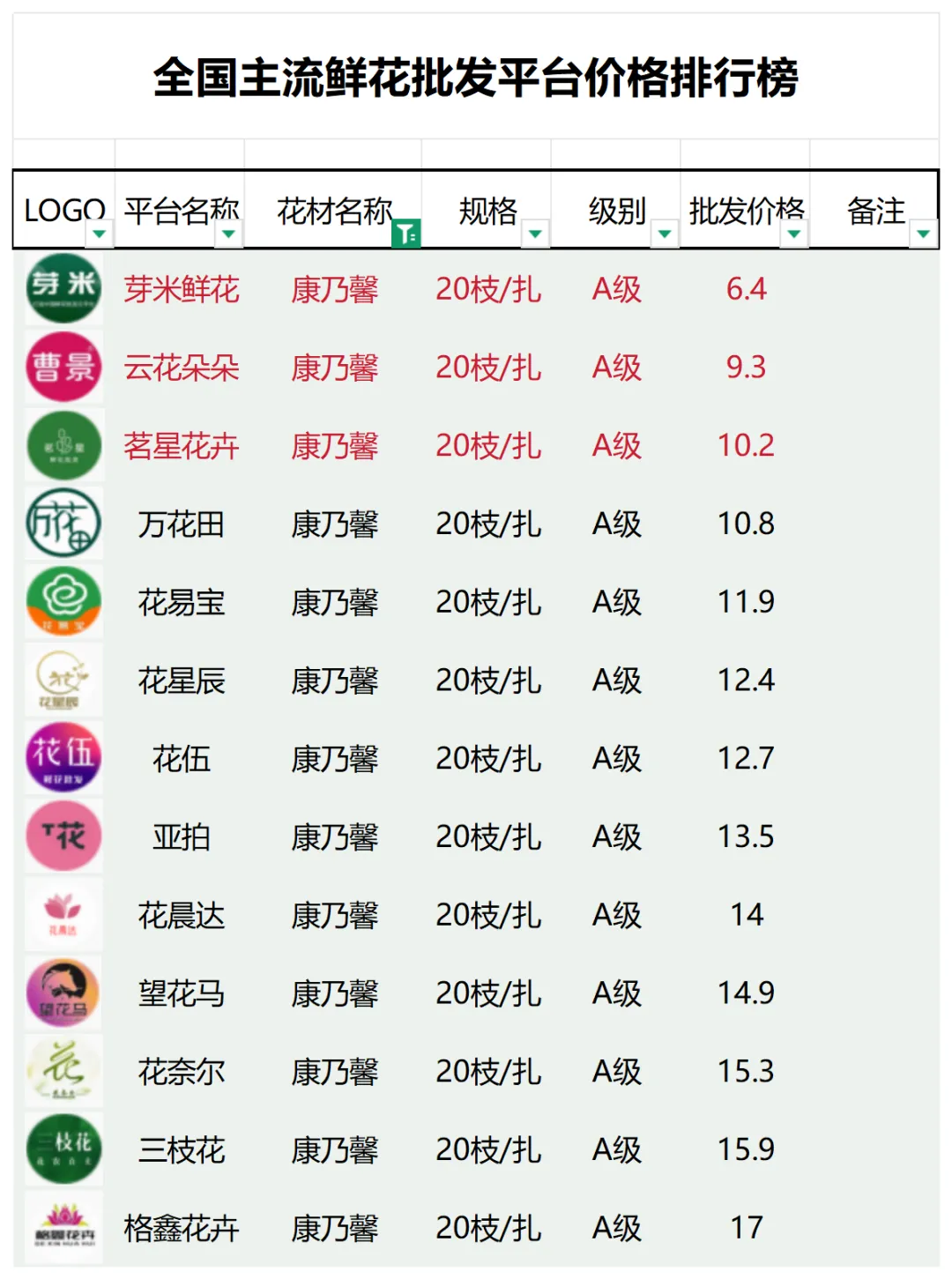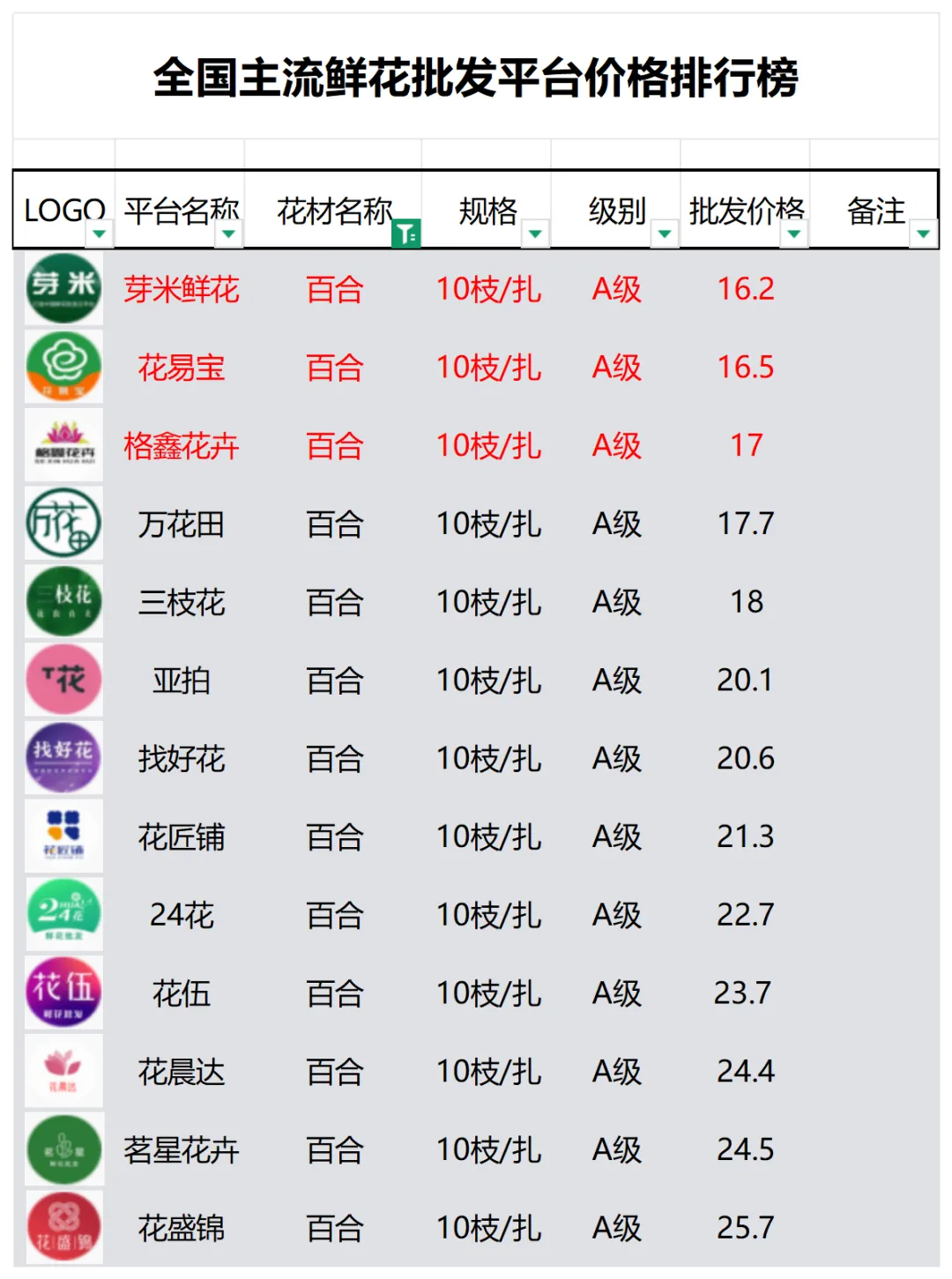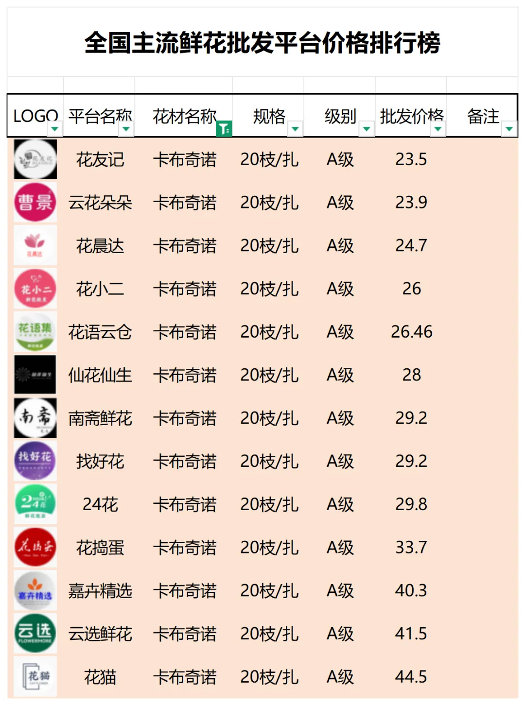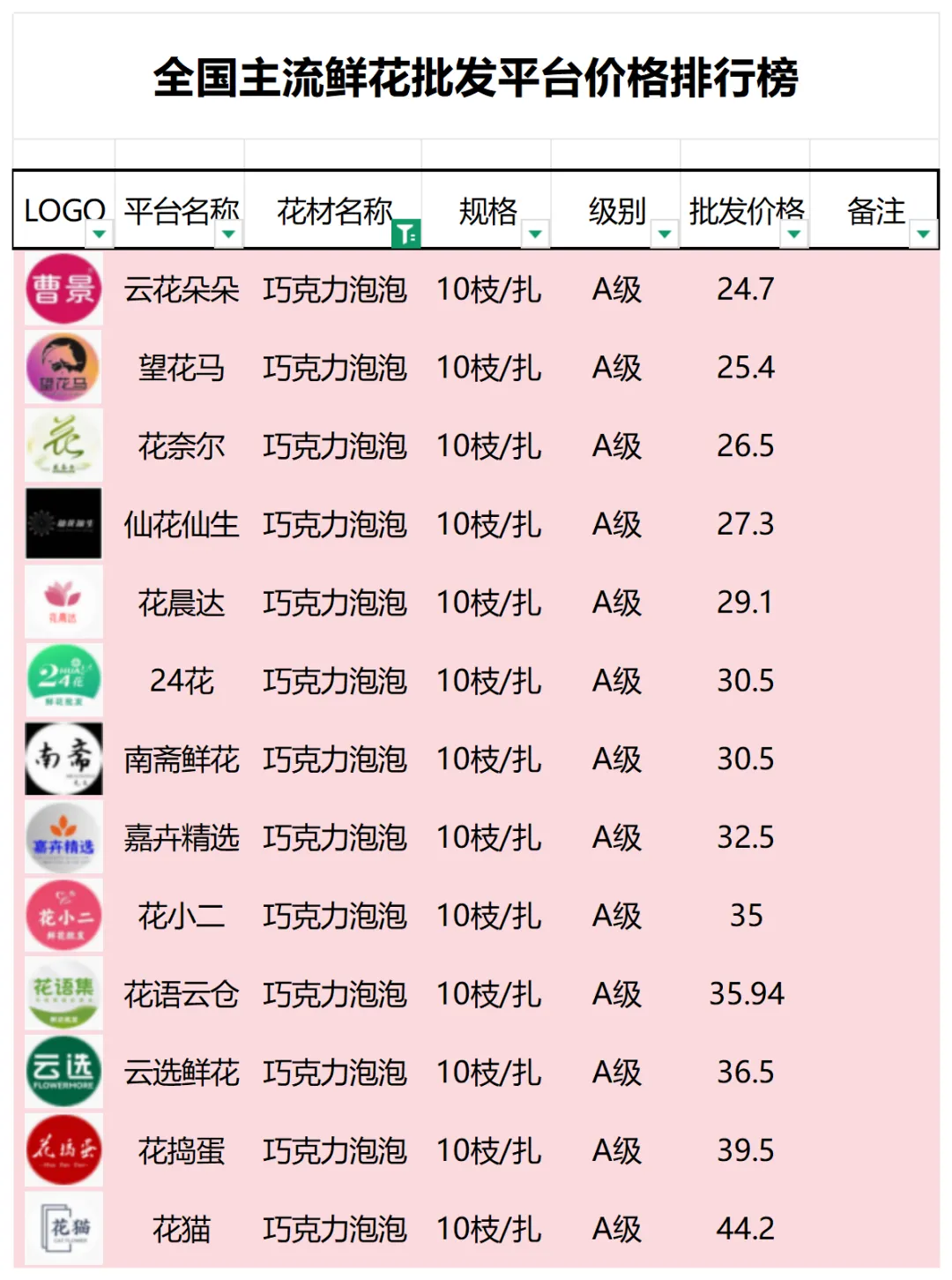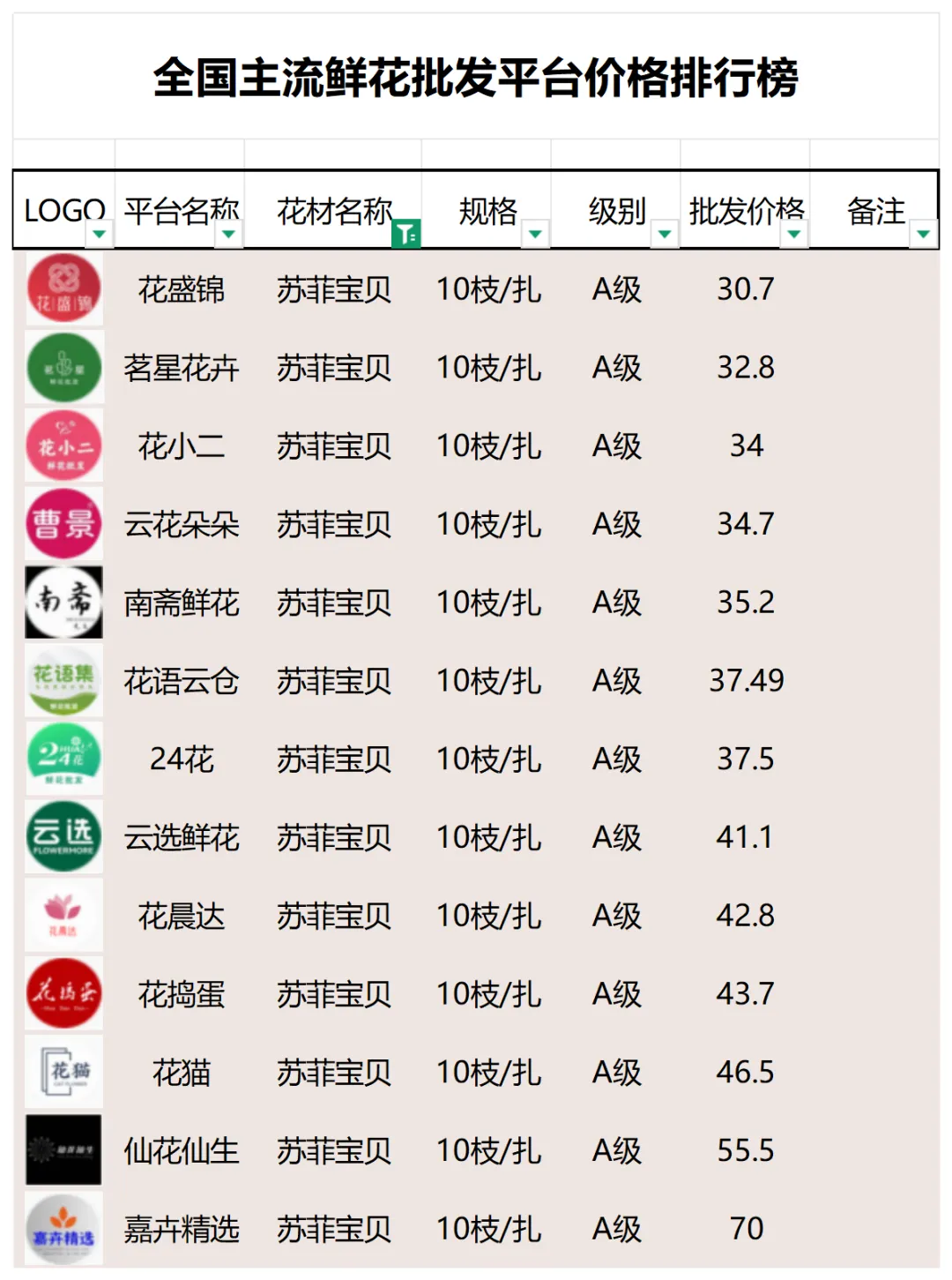 2、本數據只收錄A級花材批發價格,覆蓋全國大部分主流鮮花批發平臺