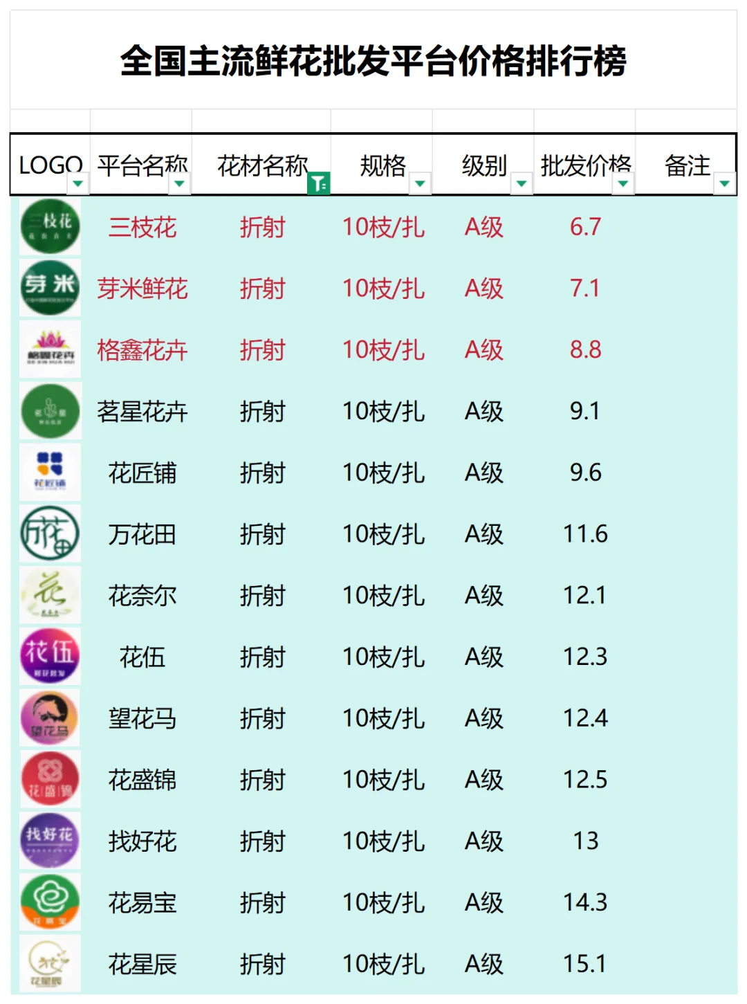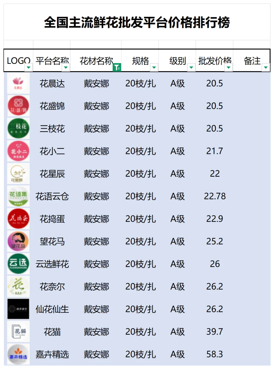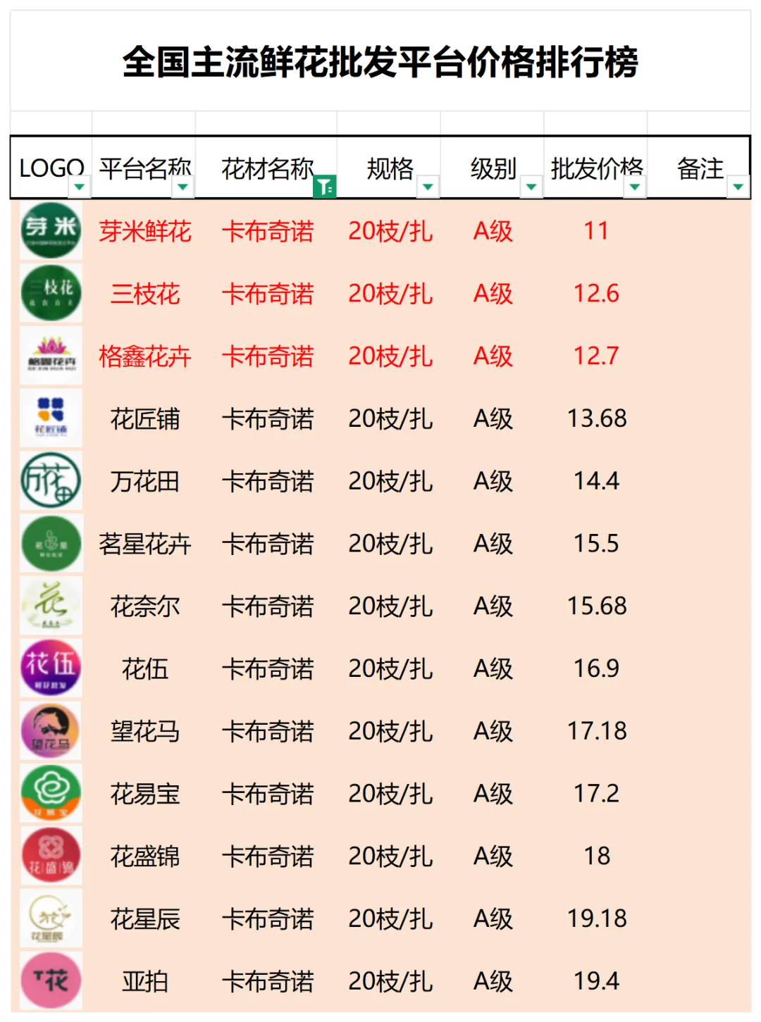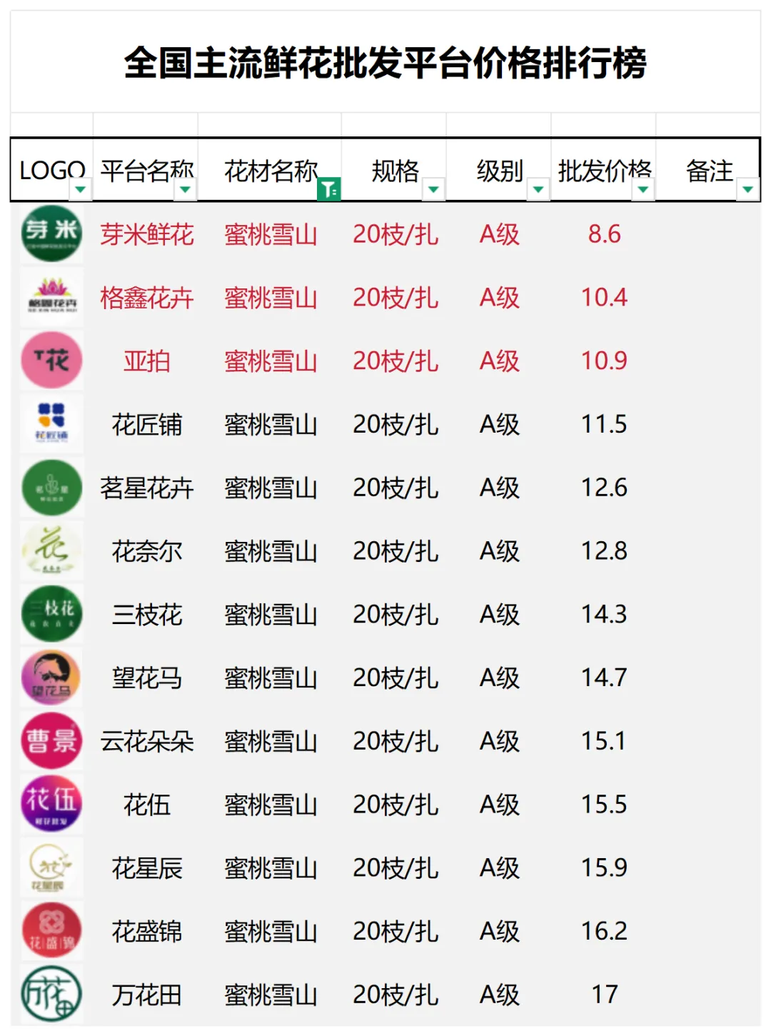 2、本數據只收錄A級花材批發價格,覆蓋全國大部分主流鮮花批發平臺