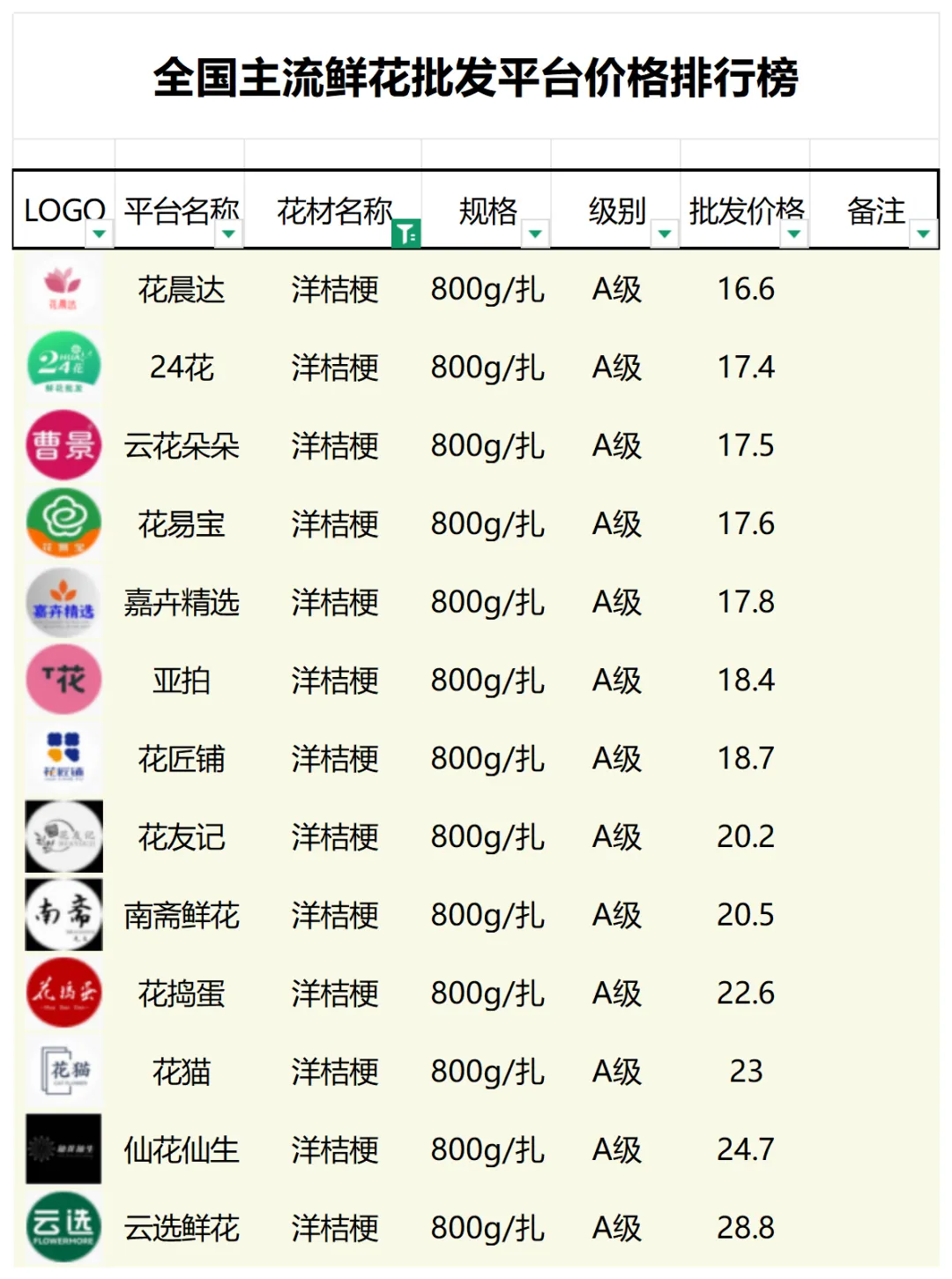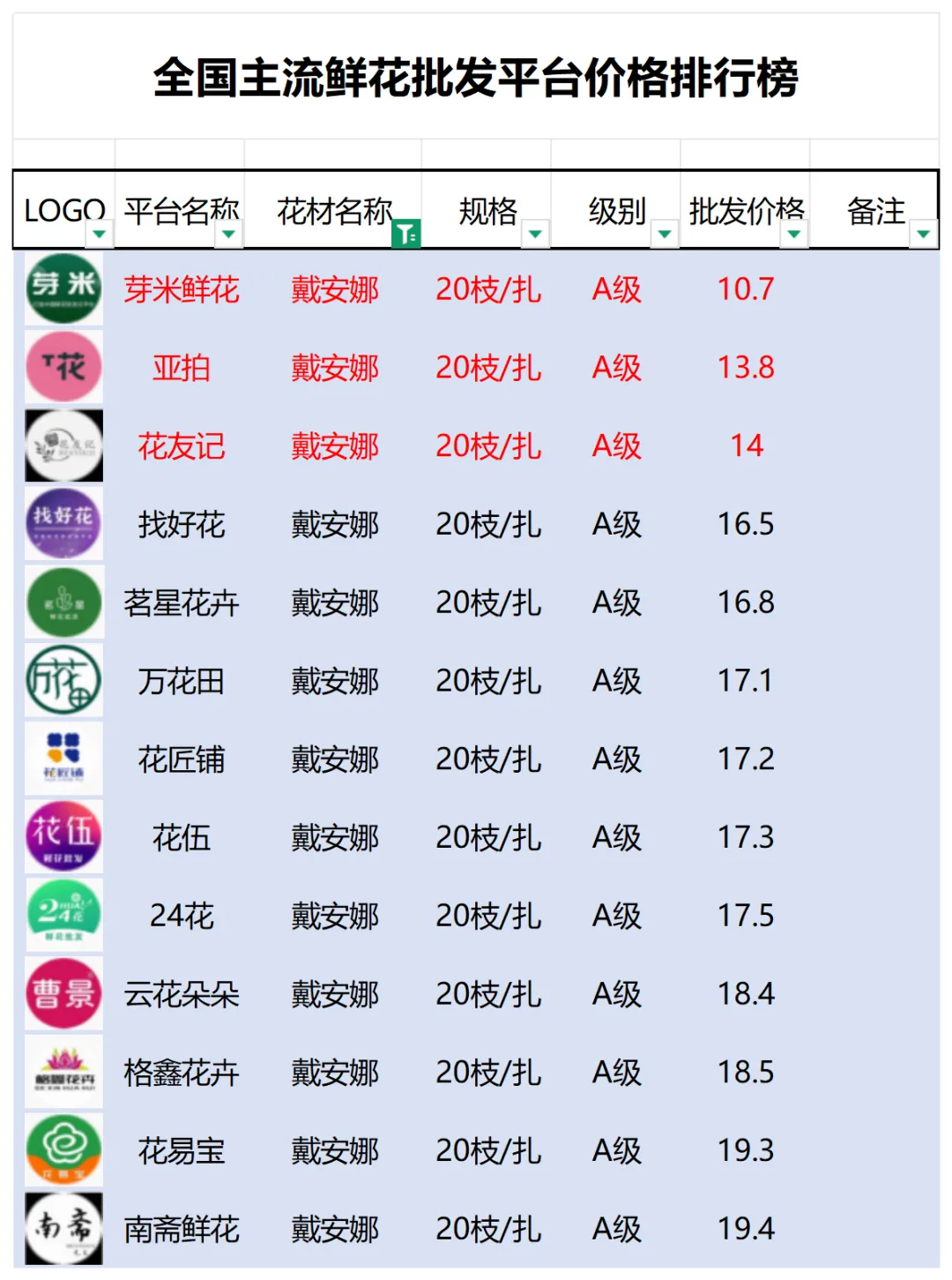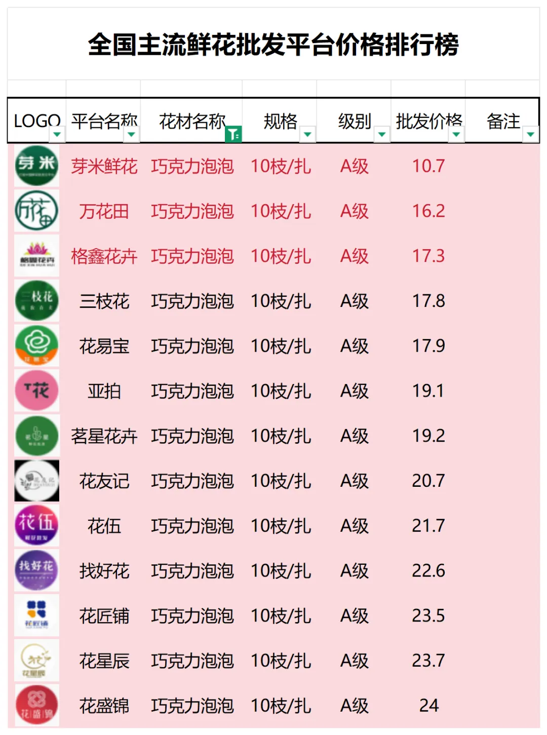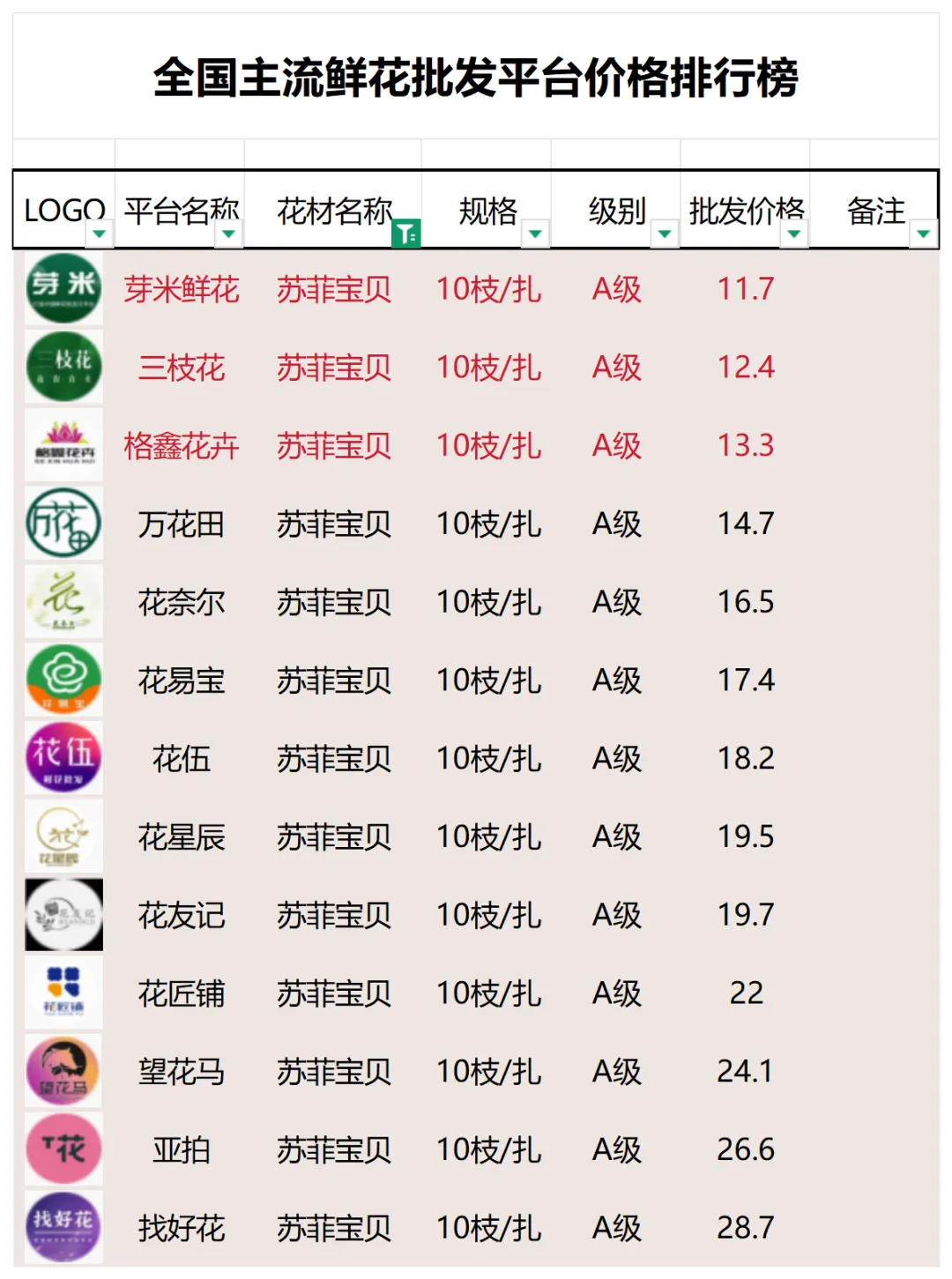 2、本數據只收錄A級花材批發價格,覆蓋全國大部分主流鮮花批發平臺