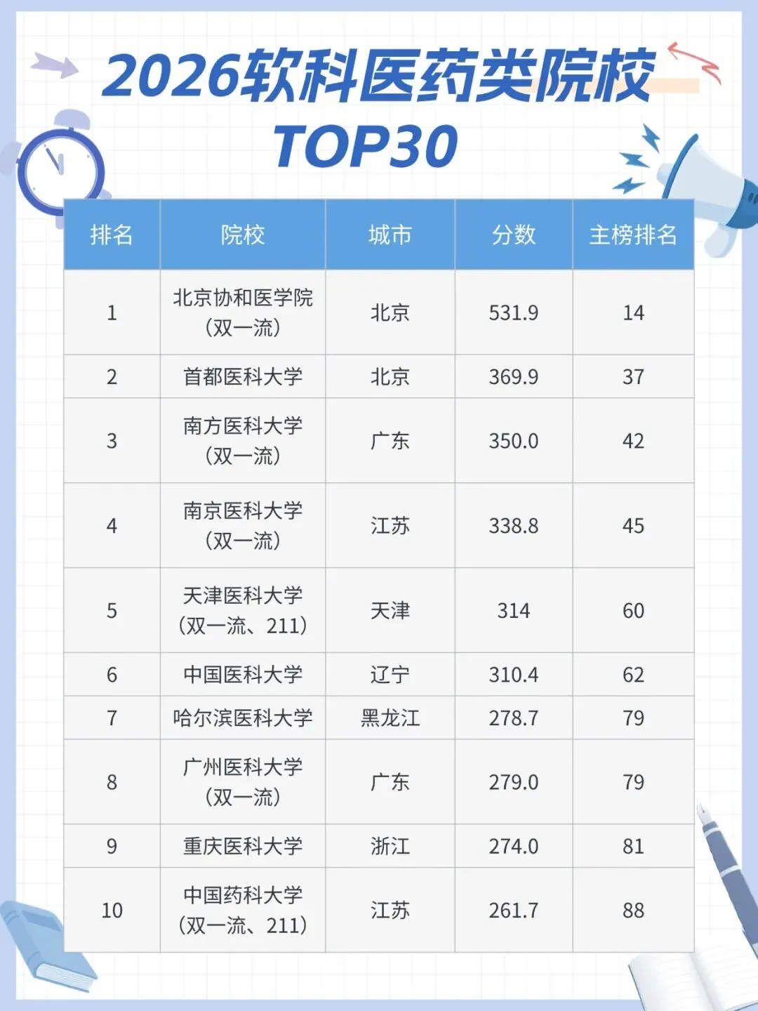 - 西醫類:優先考慮協和、首醫、南醫、天醫等院校,學科實力強、資源平臺高,適合有沖勁、目標是三甲醫院或頂尖科研院所的考生。