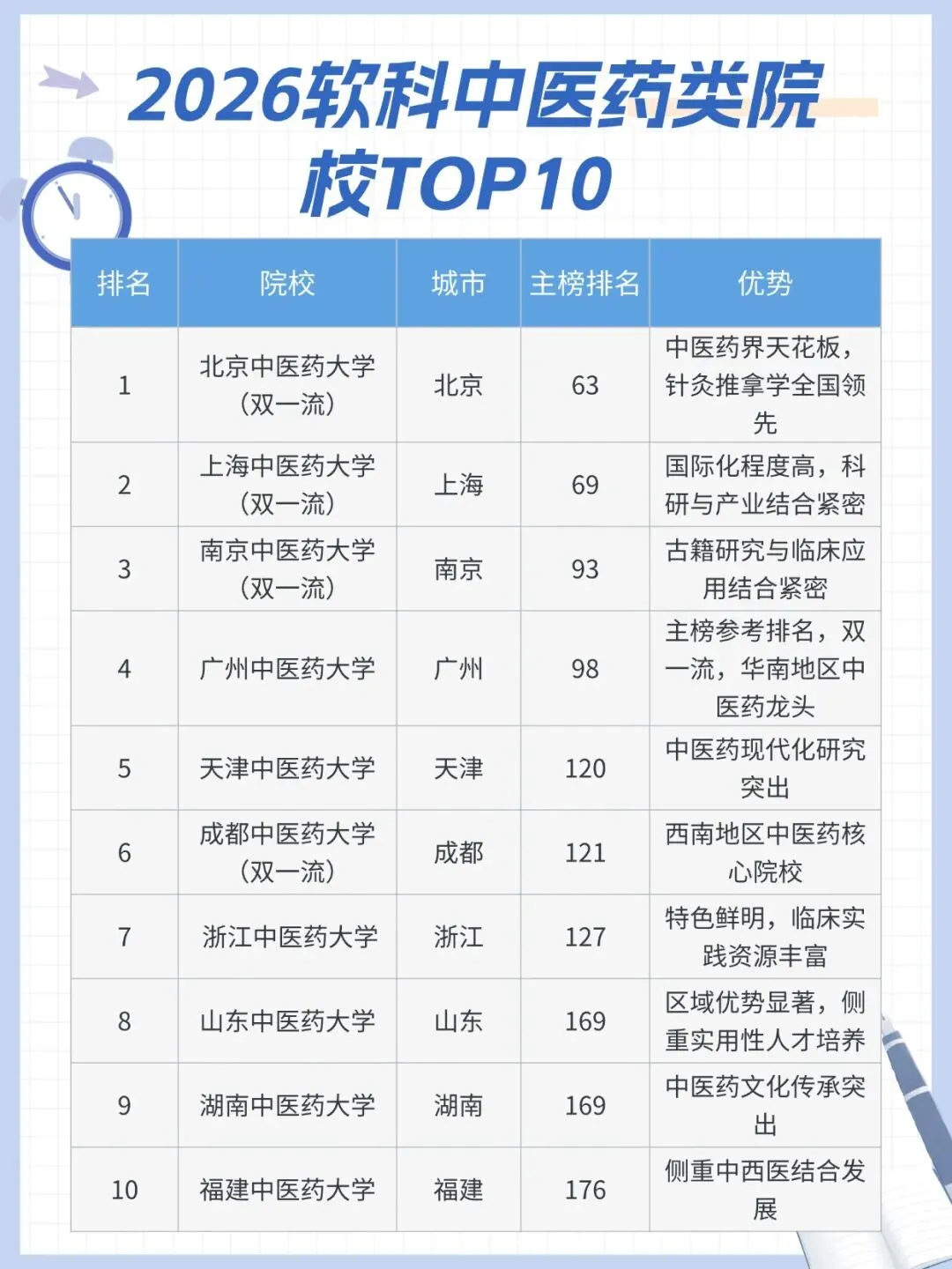 - 中醫藥類:北中醫、上中醫、南中醫是第一梯隊,行業認可度拉滿,無論是臨床就業還是學術深造都極具優勢。