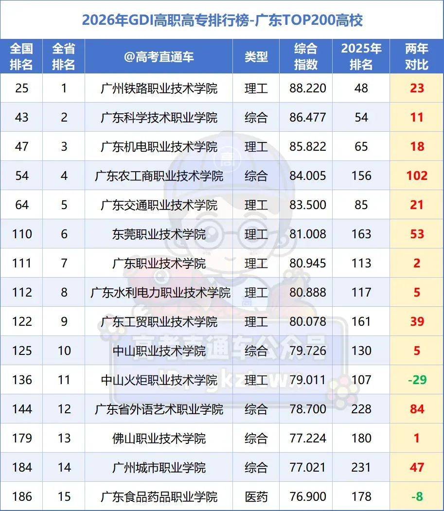 根據(jù)2026年GDI高職高專排行榜,廣東高校的排名格局因深圳信息職業(yè)技術(shù)大學(xué)、廣州職業(yè)技術(shù)大學(xué)、順德職業(yè)技術(shù)大學(xué)三所頭部院校升本退出而發(fā)生了顯著變化。