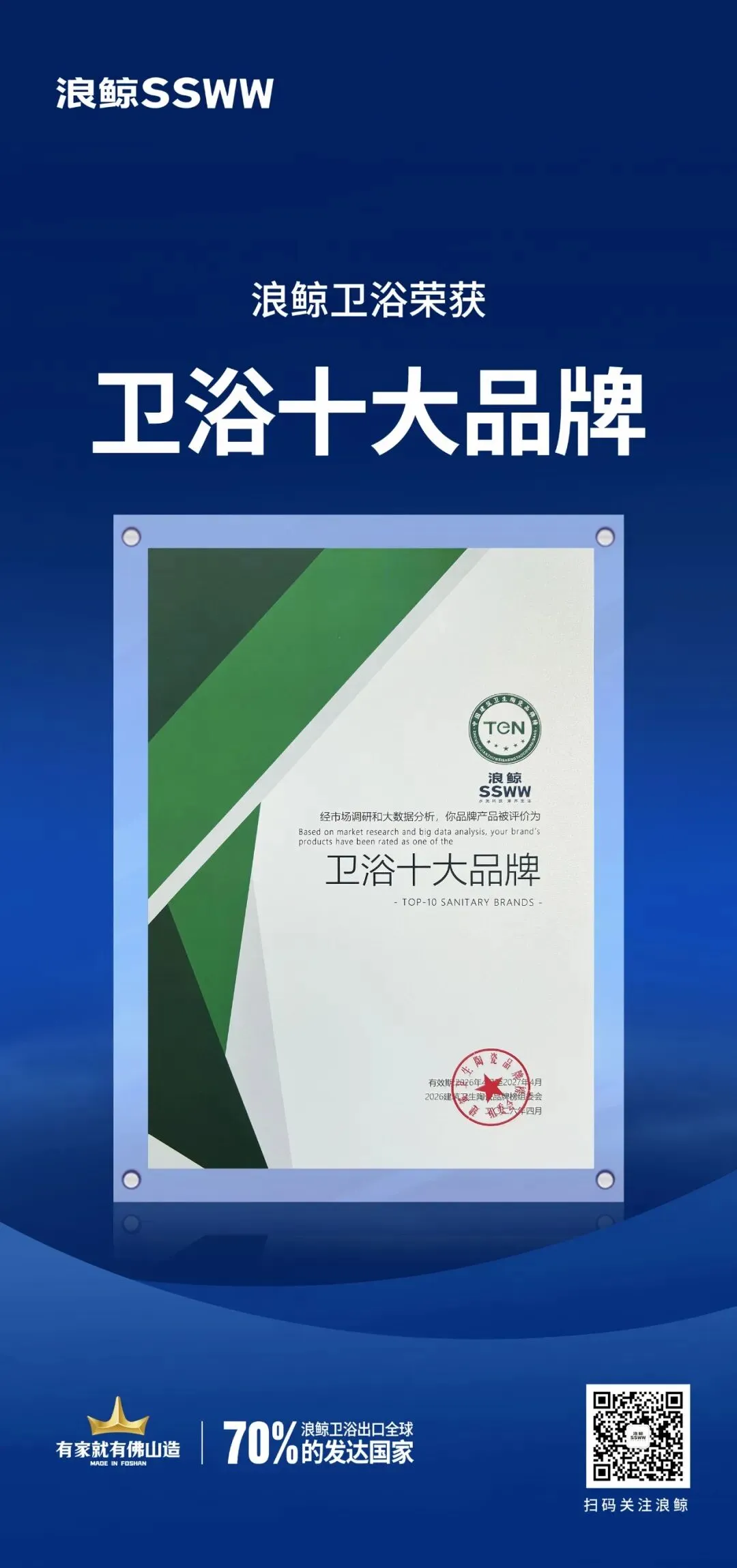 品牌秉持“水洗科技”的理念,聚焦健康化、智能化、場景化產品迭代,以鯨噴洗科技、微氣泡美膚、鯨酥水等核心技術,打造貼合用戶需求的高品質衛浴解決方案,贏得全球110個國家和地區消費者的信賴與認可。此次斬獲 “衛浴十大品牌”,是行業對浪鯨在品牌實力、產品創新、市場影響力等方面的高度肯定。